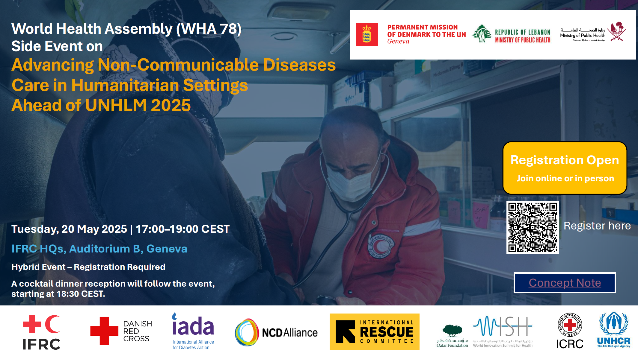 This high-level WHA78 side event will bring together government representatives, humanitarian actors, civil society, and technical experts to explore strategies for strengthening the prevention and care of NCDs in humanitarian settings. In the lead-up to the 2025 UN High-Level Meeting on NCDs, the event aims to generate political momentum, share lessons learned from the field experiences, and promote practical solutions that ensure continuity of NCD care during crises.