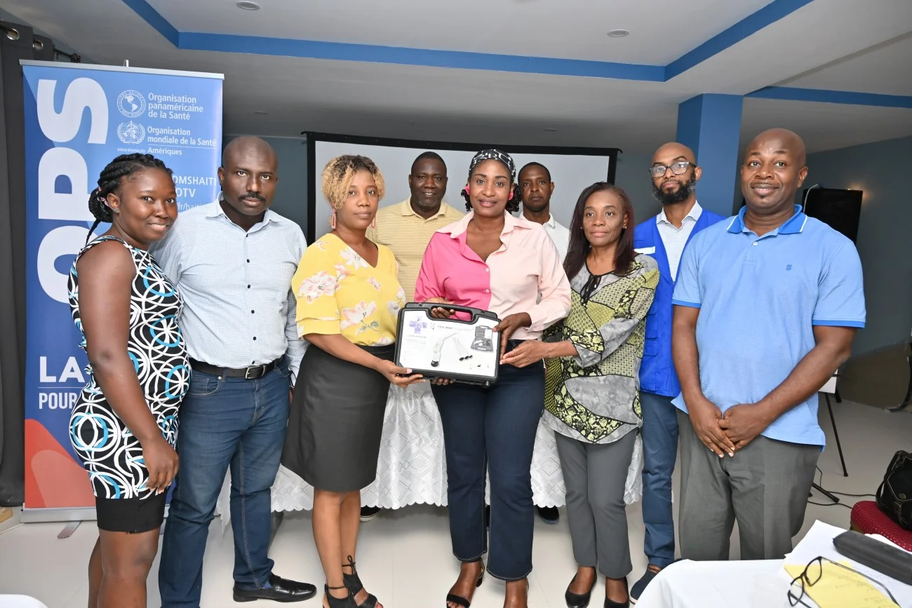 Port-au-Prince, June 7, 2024 (PAHO) - The Direction de la Santé de la Famille (DSF) and the Programme Nationale de Lutte contre le Sida (PNLS) of the Ministry of Public Health and Population (MSPP), with the full support of the Pan-American Health Organization (PAHO/WHO) and other MSPP partners including UNAIDS, a week of training, from May 27 to 31, 2024, in Les Cayes, on the screening and treatment of precancerous cervical lesions by thermocoagulation for fourteen healthcare providers from the Grand Sud and Ouest departments. At the end of this activity, a thermocoagulation device was given to each of the departments represented, bringing to 10 the number of departments equipped with such a device.
