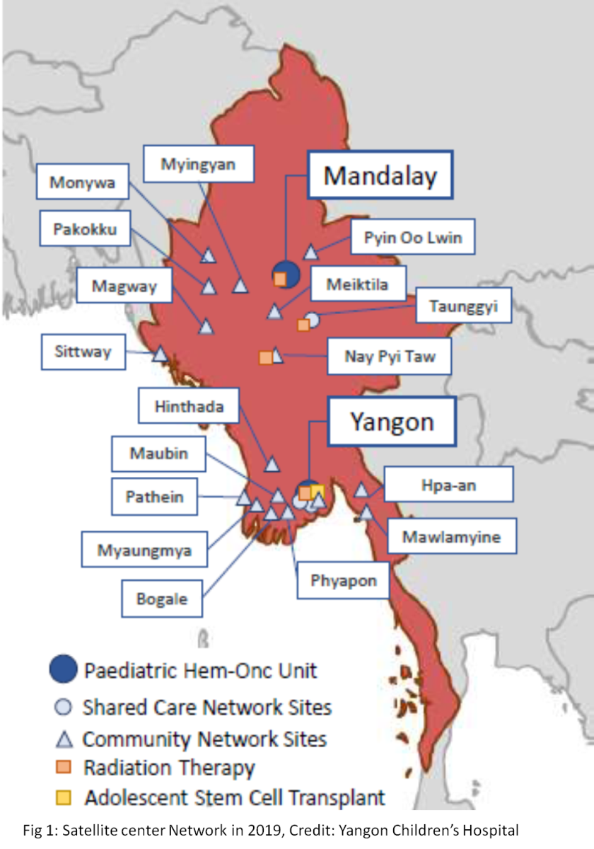 Childhood cancer is an important cause of childhood disease burden. It is curable with affordable care in vast majority of cases. About 1,500 - 2,000 new childhood cancer cases are estimated to occur every year in Myanmar. There are two hospitals providing comprehensive childhood cancer services in the country. Yangon Children’s Hospital (YCH), located in Yangon city, provides services to patients mostly from southern part of Myanmar and Mandalay Children’s Hospital (MCH), located in Chanayethazan township, provides services to patients from remaining parts of Myanmar. The need for travel to a faraway city for treatment of a child adds significantly to the burden on families. This is a common situation in many other low- and middle-income countries.