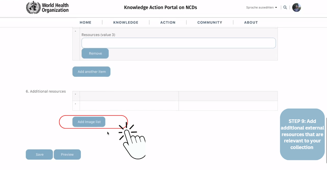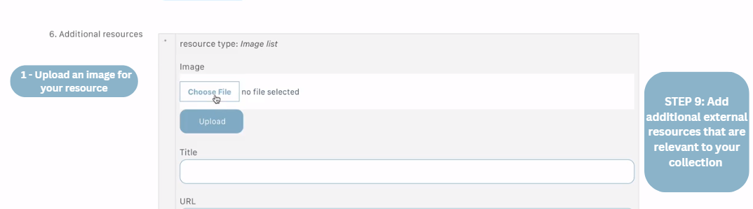 9. Add additional resources that you would like to include in your collection. Here, you can reference external external resources such as reference webpages, articles, or other resources. Please note that extermal resources need to respect the KAP Community and User Guidelines.