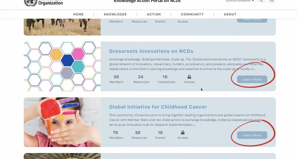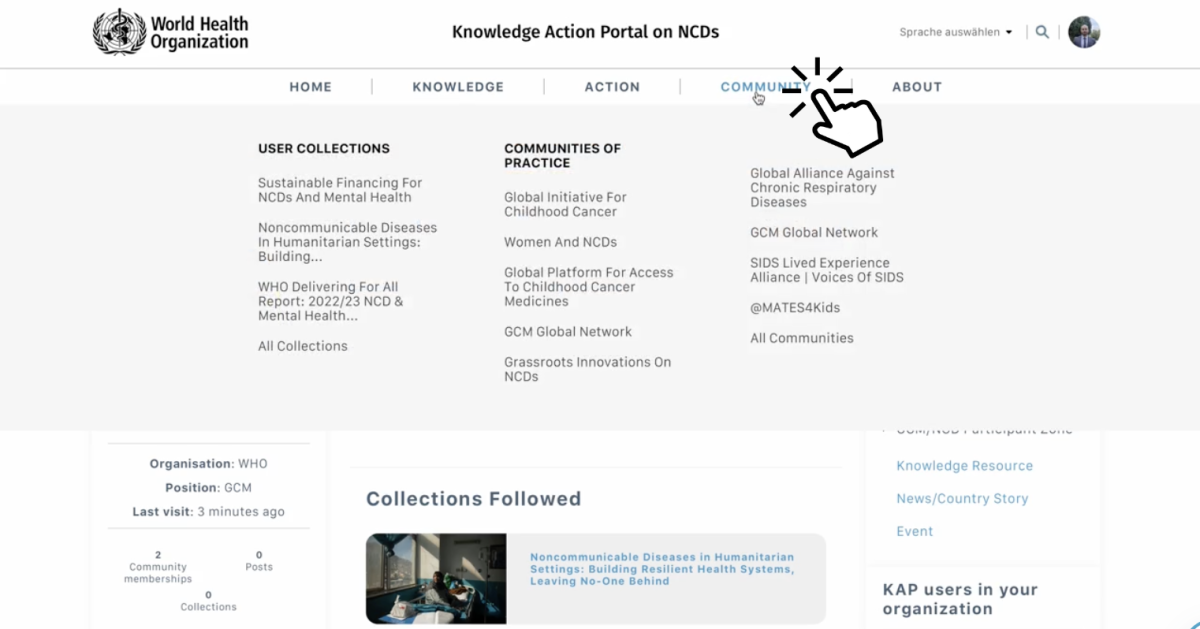 KAP Communities of Practice offer a digital platform to connect groups with common interests and goals on a dedicated, WHO-hosted platform dedicated to NCDs and mental health. In a KAP community, members can share news, events, best-practices, or challenges on noticeboards and community repositories, connect with fellow community members and engage in discussions.