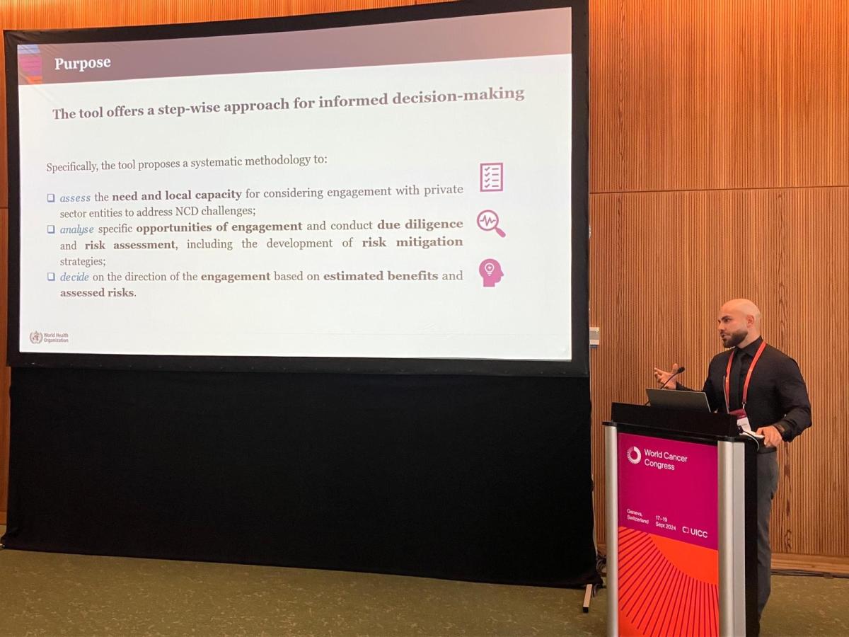 A major challenge discussed during the session was the limited capacity of governments and health actors to identify, manage, or mitigate risks, including conflicts of interest, when engaging with the private sector to safeguard public health. Hussein Alshamali, from WHO’s Global Coordination on NCDs, presented a new practical tool developed by the World Health Organization (WHO), which guides governments in making informed decisions on potential engagements with private sector entities.