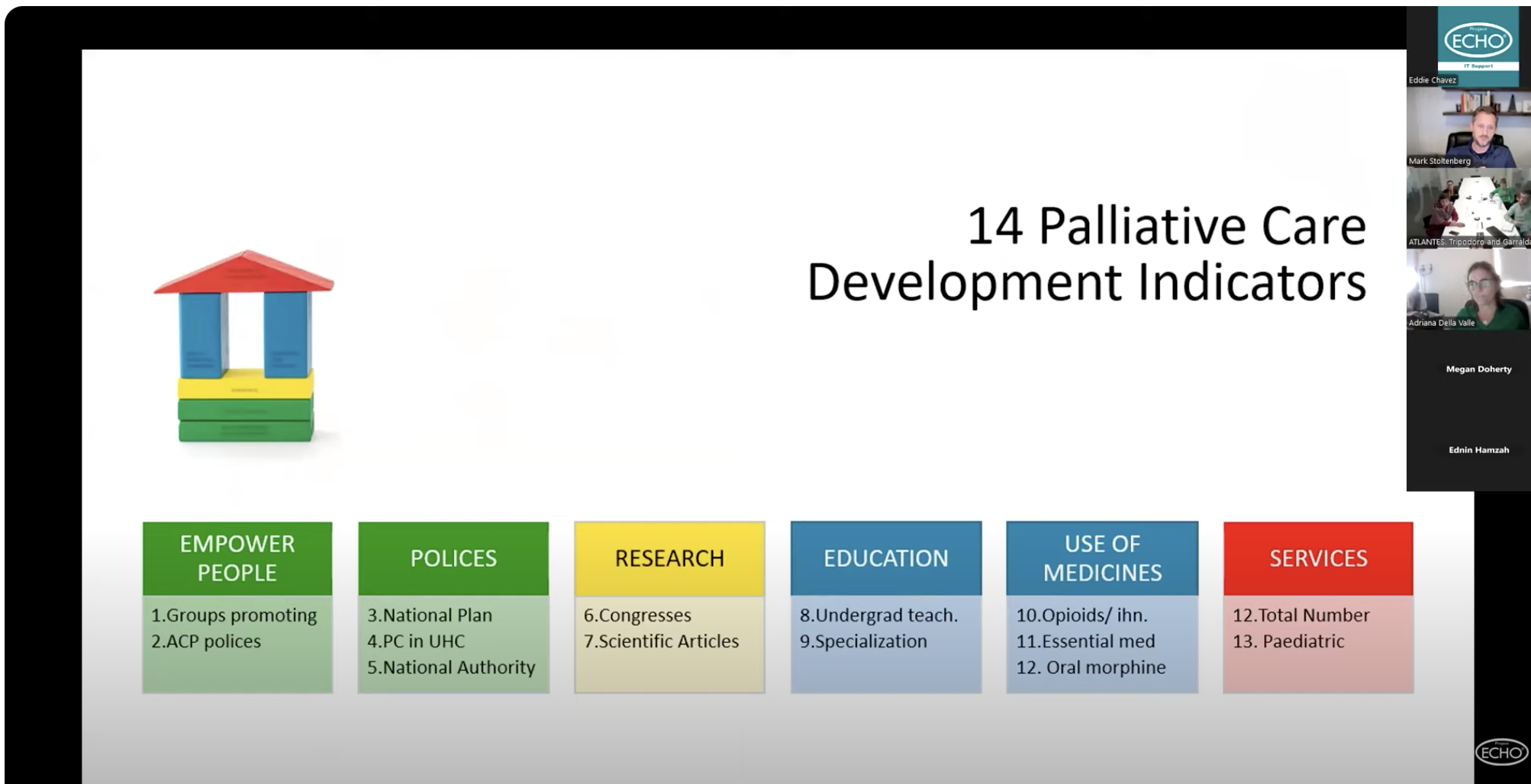 Project ECHO (Extension for Community Healthcare Outcomes) is a digital learning model that connects healthcare professionals globally. Using ECHO’s online learning management platform (iECHO.org), this program includes a series of monthly online sessions focused on developing training materials and evaluation tools and resources to strengthen health systems in palliative care. With the use of digital innovation, the program eliminates the need for travel to complete this important work.
