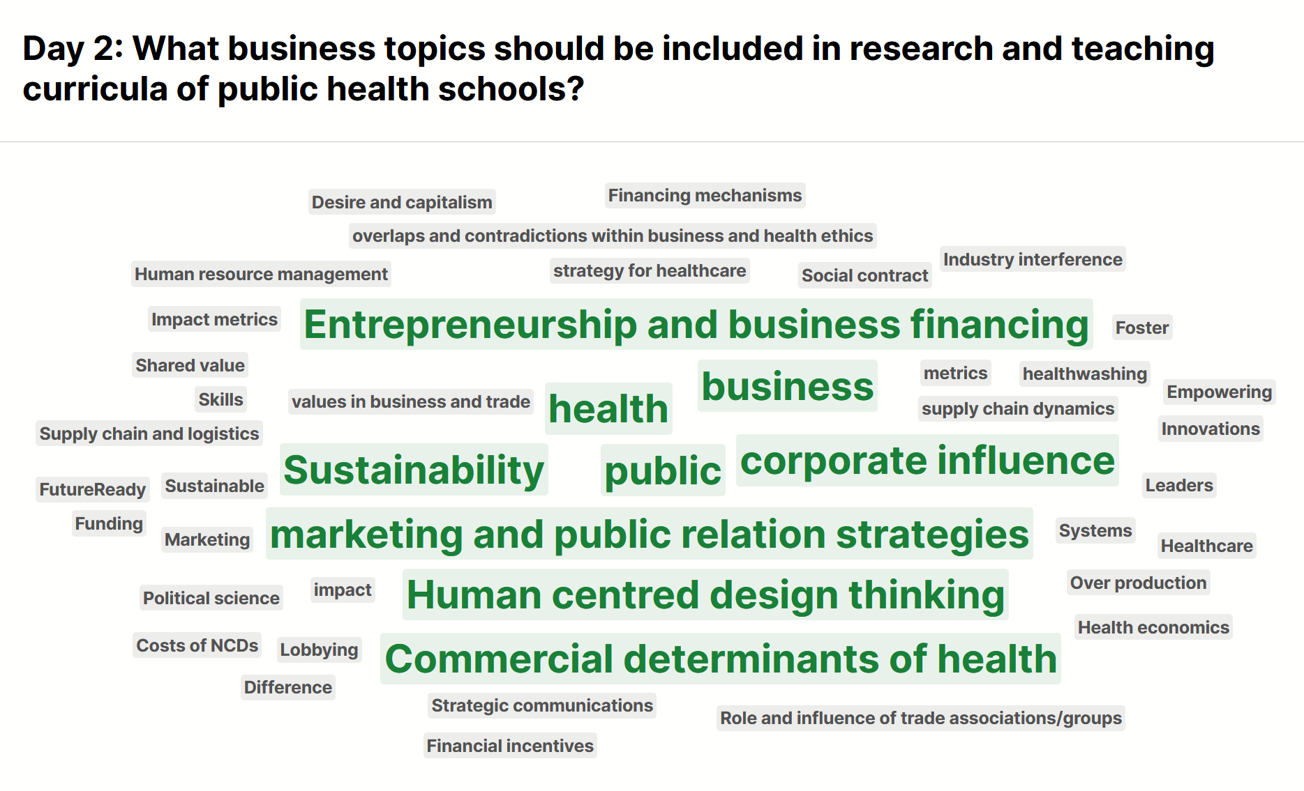 Collaborative word cloud on including business topics in public health school curricula.